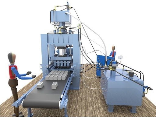 Fully automatic fly ash brick machine. 3000 bricks per hour capacity. Model AT 12 200 ton single cylinder hydraulic press with brick belt ejection system.